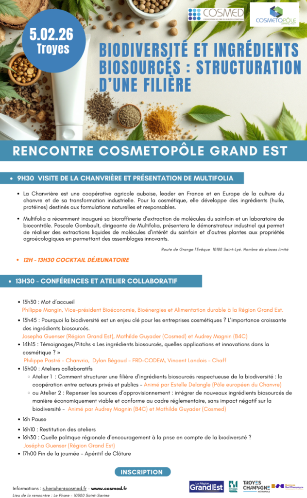 Le 5 février 2026, participez à la rencontre Cosmed Grand Est « Biodiversité et ingrédients biosourcés : structuration d’une filière »