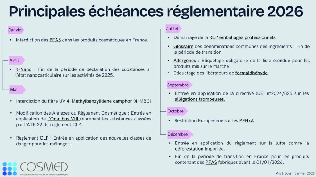 Cosmed actualise son calendrier annuel de vos obligations règlementaires pour 2026 (édition décembre 2025) afin de mieux visualiser les échéances et changements réglementaires qui vont impacter l’industrie cosmétique cette année.