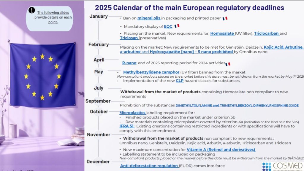 Cosmed has updated its annual calendar of regulatory obligations for 2025 (September 2025 edition) to provide a clearer overview of the deadlines and regulatory changes that will impact the cosmetics industry this year.