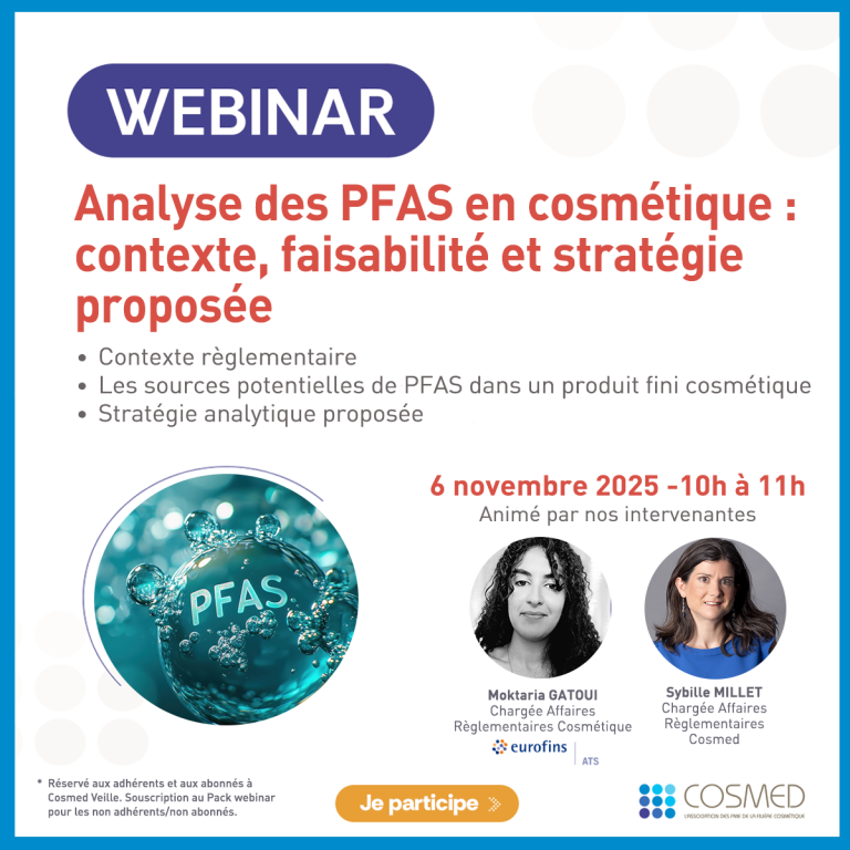Le 6 novembre à 10h, participez au Webinar organisé par Cosmed sur l’analyse des PFAS en cosmétique : contexte, faisabilité et stratégie proposée.