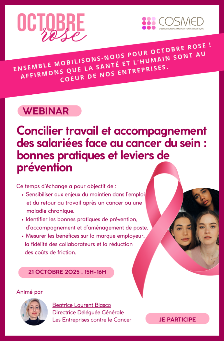 Mardi 21 octobre 2025 . 15h-16h, participez au Webinar organisé par Cosmed « Concilier travail et accompagnement des salariées face au cancer du sein : bonnes pratiques et leviers de prévention »