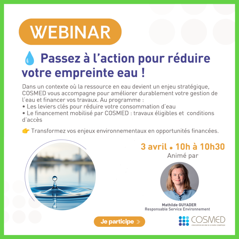 Le 3 avril à 10H participez au webinar organisé par Cosmed pour bénéficier de l’AMI qui accompagne les entreprises dans la réduction des micropolluants et la maîtrise de leur consommation d’eau