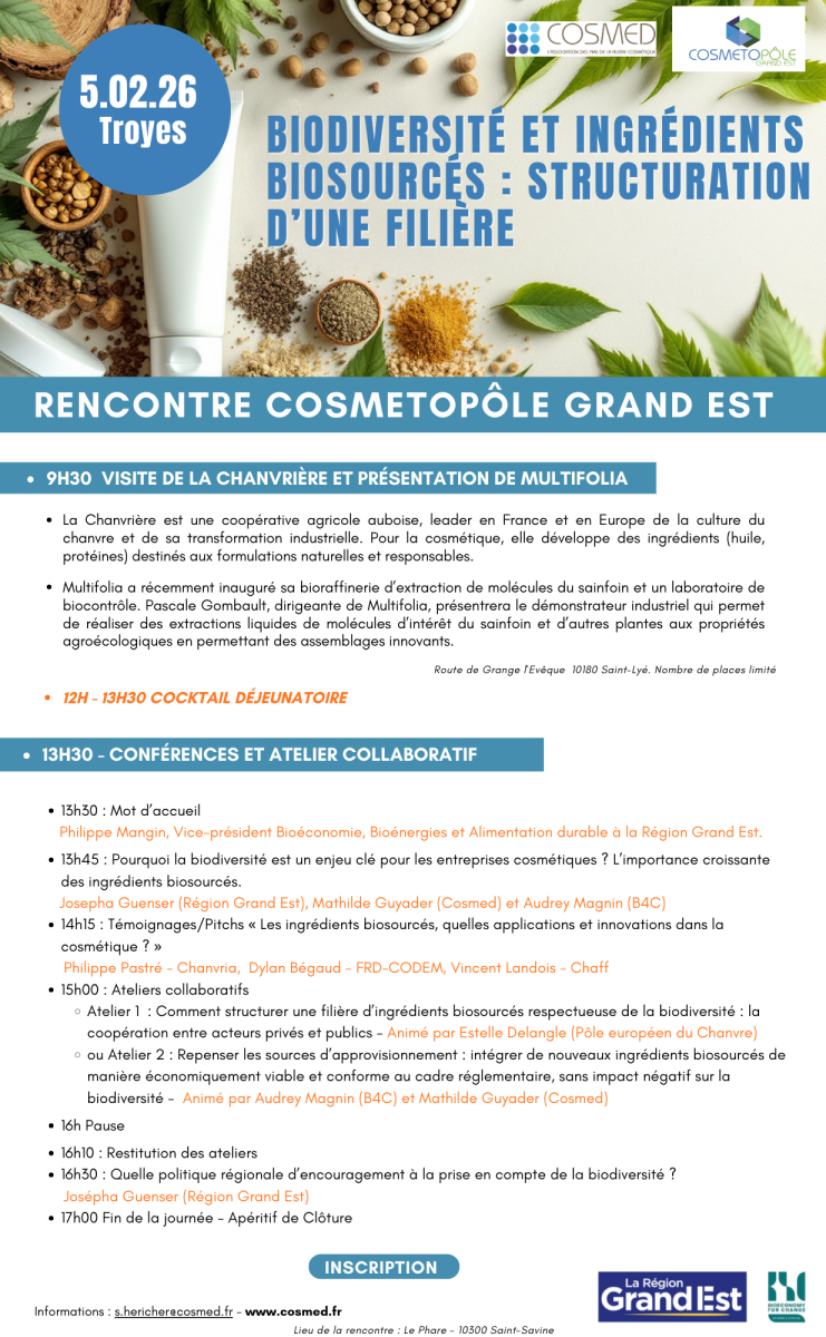 Le 5 février 2026, participez à la rencontre Cosmed Grand Est « Biodiversité et ingrédients biosourcés : structuration d’une filière »